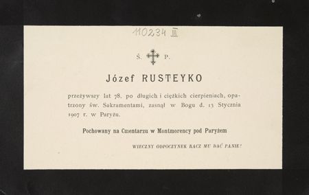 [Nekrolog. Incipit] Ś. P. Józef Rusteyko przeżywszy lat 78 [...]. - [Miejsce nieznane : wydawca nieznany, 1907]. - [1] k. ; 14x21 cm. ; koperta.