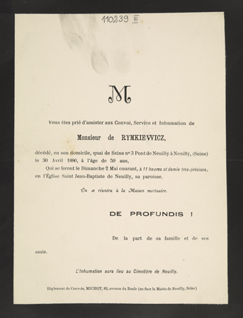 Zawiadomienie o pogrzebie na cmentarzu w Neuilly.
