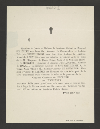 [Nekrolog. Incipit] M Monsieur le Comte et Madame [...] Comtesse Constance de Rzewuska née Iwanowska leur mère [...]. - [Miejsce nieznane : wydawca nieznany, 1880] (Kijów : Druk. W. Frąckiewicza). - [1] karta złożona ; 27x21 cm.