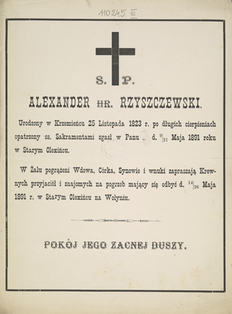 Zawiadomienie o pogrzebie w Starym Oleksińcu na Wołyniu.