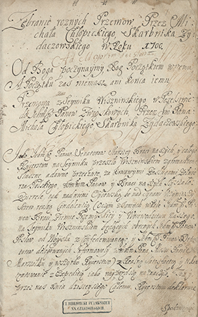 Mowy: -"Mowa Jana Kazimierza [...] dziękując [...] za koronę" [1668], s. 93 95. -"Zebranie różnych przemów przez Michała Chłopickiego skarbnika żydaczowskiego w roku 1700", s. 1 8. -"Copia mowy [...] Stanisława [...] Suchorzewskiego posła wielkopolskiego do JKMci [Augusta II]" 20 III 1701, s. 123-127.