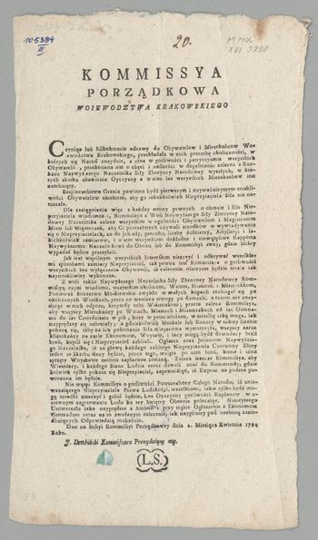 Na końcu: Dan na Sessyi Kommissyi Porządkowey dnia 2. Miesiąca Kwietnia 1794 Roku. [sygn.] J. Dembiński Kommissarz Prezyduiący.