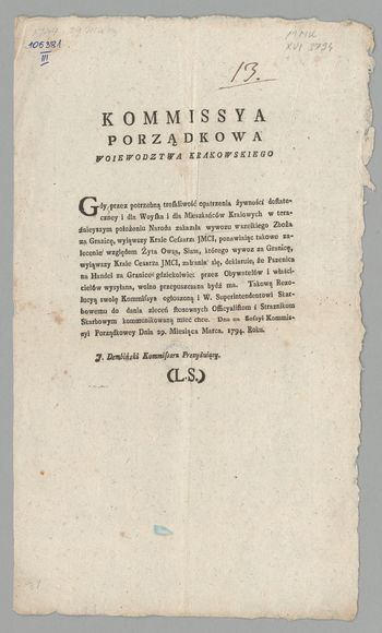 Na końcu: Dan na Sessyi Kommissyi Porządkowey Dnia 29. Miesiąca Marca 1794 Roku. [sygn.] J. Dembiński Kommissarz Prezyduiący.