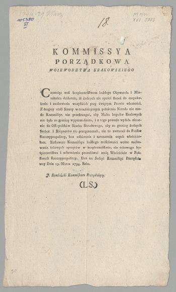 Na końcu: Dan na Sessyi Kommissyi Porządkowey Dnia 29. Marca 1794 Roku. [sygn.] J. Dembiński Kommissarz Prezyduiący.