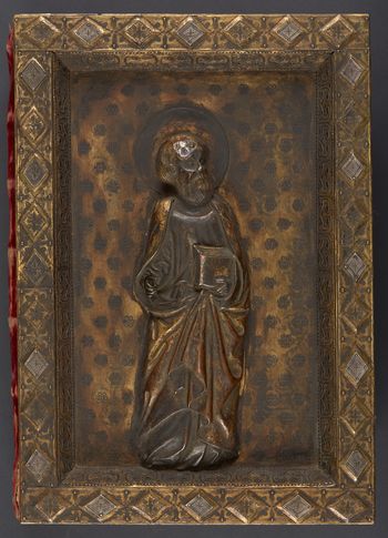 Pierwotna oprawa z desek pokrytych baranią skórą (zob. Catalogue de Livres). Obecna złożona w XIX w. ze starszych elementów, zapewne powstała po r.1878 (u Czartoryskich albo jeszcze przed aukcją), po opuszczeniu klasztoru. Deski, tylna obłożona wiśniowym wytartym aksamitem, przednia obita złoconą blachą miedzianą, zdobioną wytłoczonym w niej ornamentem. W zwierciadle oprawy metalowa figura świętego (Pawła?), w długiej tunice, w lewej ręce trzyma księgę, prawa osobno odlana, obecnie jest ruchoma, niegdyś może z mieczem(?). Figurka pochodzi prawdopodobnie z XIII/początku XIV w. (raczej bardziej z XIV w. ze względu na układ fałd jego szaty, informacja Katarzyna Płonka-Bałus) z wschodniej Francji lub z Niemiec z Nadrenii. Ornament ramy jest może z początków XIII w. (mógłby powstać też w Nadrenii), ale może również być wytworem XIX w. ze starej sztancy. Wierzchnia listwa ramy, XV(?) w., z południowych(?) Niemiec. Dokładny opis zob. Komornicki.
