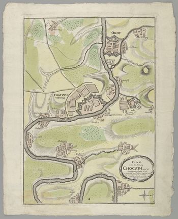 Plan von der Festung Choczim, und der Umliegenden Gegend. - Zu Franckfurt am Maÿn : zu finden beÿ C. L. Thomas Ingenieur und Geographe, 1788. - 1 mapa : miedzior kolor. ręcznie ; 38,0x27,0 cm, na ark. 44,0x35,0 cm.