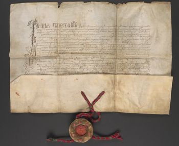 Pieczęć króla Zygmunta Starego zawieszona na jedwab. czerwono-zielonym sznurku.
