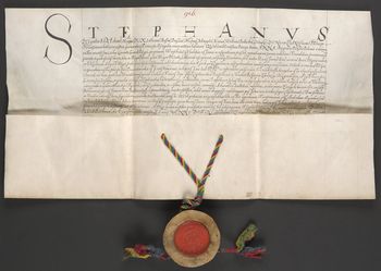 Pieczęć króla Stefana Batorego zawieszona na jedwabnym kolorowym sznurku.