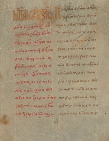 Dekoracja malarska: miniatura całostronicowa przedstawiająca Konstantyna, Michała i Teodora; tempera i złoto malarskie.