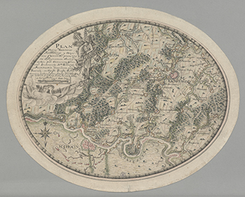 Tytuł i podziałka liniowa w lewej górnej części, oddzielona od treści mapy panopliami.