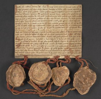 Pieczęcie zawieszone na czerwonych sznurkach: biskupa [?] [uszkodzona]; księcia mazowieckiego i sandomierskiego Bolesława I; biskupa [?] [w znacznym stopniu uszkodzona]; księcia kujawskiego i łęczyckiego Kazimierza I [uszkodzona]; brak pieczęci drugiej, pozostało nacięcie w pergaminie na jeden sznurek.