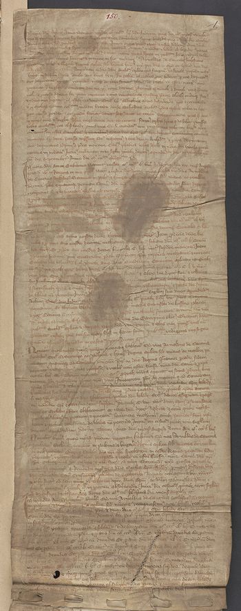 Dokument jest w połowie zszyty paskiem pergaminowym, w dużym stopniu zniszczony przez liczne plamy z wilgoci i pomarszczenie pergaminu.