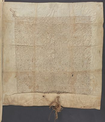 Pieczęci króla Władysława Jagiełły brak, pozostał po niej czerwono-żółty jedwabny sznurek.