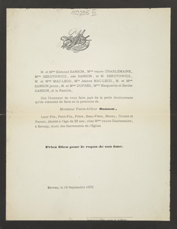 [Nekrolog. Incipit] M M. et Mme Edmond Sanson [...] Monsieur Pierre-Arthur Sanson, Leur Fils [...]. Bernay, le 19 Septembre 1872. - [Miejsce nieznane : wydawca nieznany, 1872] (Bernay : Imp. veuve A. Lefèvre). - [1] karta złożona (4 strony) ; 27x21 cm.