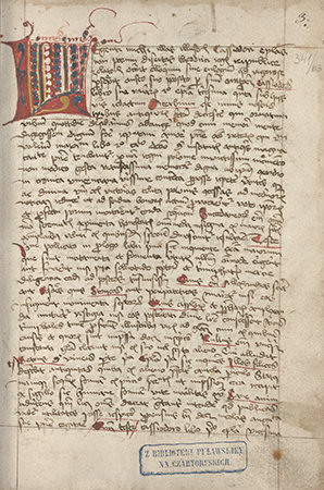 2 poł. XV w., deski w ciemnej skórze z ornamentem liniowym, guzy ochronne i dwa skórzane zapięcia na ćwieki. W grzbiecie trzy zwięzy i kapitałki. Po konserwacji przez Spółdzielnię "Starodruk" (10 IX 1963, cf. teczka konserwacja w B.Czart.) grzbiet i paski spinające nowe. Na górnym przycięciu kart źle widoczne: Chronica Polonorum pia Mathe[?] 133 de Kobilin.