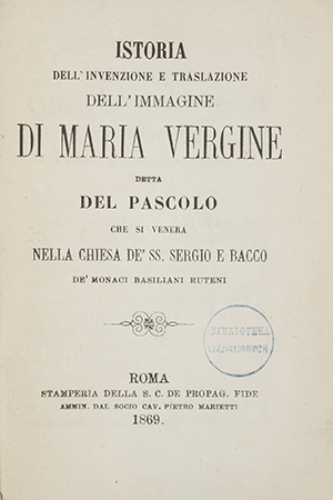 Zawiera m.in.: Apparecchio di nove giorni precedenti la festa della natività di Maria Vergine che si celebra nella chiesa de SS. Sergio e Bacco de' monaci Basiliani Ruteni li 7 settembre per l'invenzione e traslazione dell'imagine della Madonna Santissima detta del Pascolo.