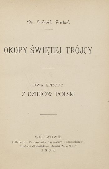 Okopy Świętej Trójcy : dwa epizody z dziejów Polski / Ludwik Finkel. - Lwów : [wydawca nieznany], 1889 (Lwów : z drukarni Wł. Łozińskiego). - [6], 69 strona, [1] karta tablic złożona ; 18 cm.