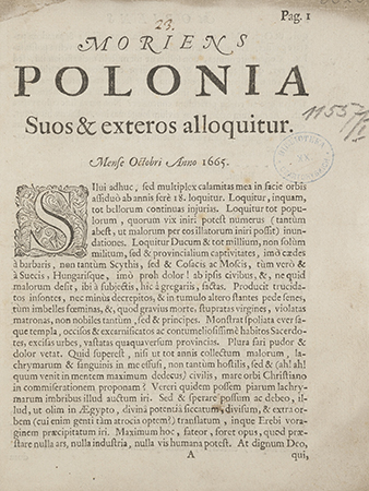 Polonia moriens suos exteros alloquitur. - [Gdańsk : wydawca nieznany, 1665]. - 8 stron, sygnowanie A⁴ ; 4°.