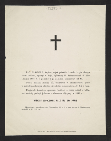 [Nekrolog. Incipit] Jan Sawicki, kapitan wojsk polskich, kawaler krzyża złotego virtuti militari [...]. - [Miejsce nieznane : wydawca nieznany, 1881] (Paris : Vve C. Zabieha). - [1] karta złożona (4 strony) ; 27x21 cm.