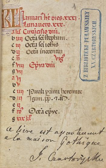 Italia północna. W kalendarzu rzymskim uwzględnione też imiona świętych z różnych prowincji Włoch, m.in. franciszkańskich (cf. Miodońska, Płonka-Bałus 2001 s. 66). W bordiurach na s. 25 i 255 tarcza ze lwem, być może herb pierwszego właściciela (cf. etiam scripturam). Na k. Iv u góry atramentem sygn. z Domu Gotyckiego No 1462. Na s. 1: Ce livre est apartenant à la maison Gothique. I. Czartoryska. Na k. II, s. 1 i s. 314 pieczątka Biblioteki Puławskiej.