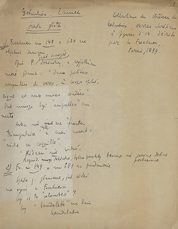 Zawiera: "Gołuchów. Zamek. Tkaniny z Egiptu". Przypuszczalnie wypis z książki pt. "Collections du Chateau de Gołuchów […]". Paris 1899, "18.9..[19]29". Szt. 1. K. 8.