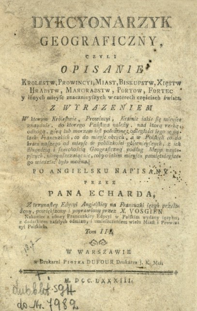 Dykcyonarzyk Geograficzny Czyli Opisanie Krolestw, Prowincyi, Miast, Biskupstw, Xięstw, Hrabstw, Margrabstw, Portow, Fortec y innych mieysc znacznieyszych w czterech częściach świata [...]. T. 3 / Po Angielsku Napisany Przez Pana Echarda. - Z trzynastey Edycyi Angielskiey na Francuzki ięzyk przełożony powiększony i poprawiony przez X. Vosgien, Nakoniec z osmey Francuzkiey Edycyi w Polskim wydany ięzyku, z dodatkiem zaszłych odmian i umieszczeniem wielu Miast i Prowincyi Polskich. - W Warszawie : w Drukarni Piotra Dufour [...], 1783. - 218, 16 stron, 67 kart, [1] strona, [2] karty ; 8°.