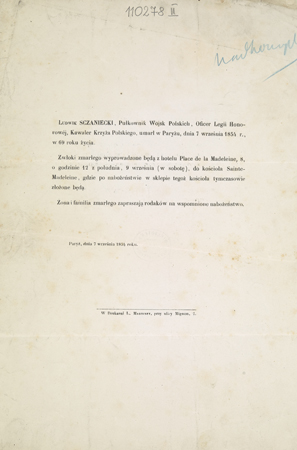 Zawiadomienie o nabożeństwie żałobnym w kościele Sainte Madeleine i pogrzebie.