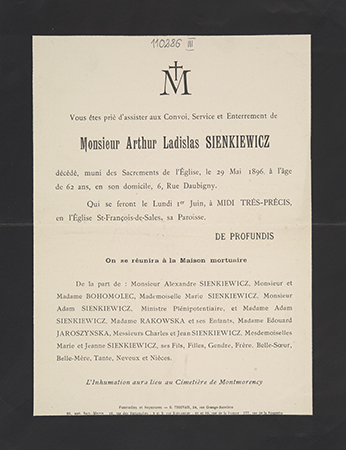 Zawiadomienie o nabożeństwie żałobnym w kościele St-François-de-Sales i pogrzebie na cmentarzu w Montmorency.