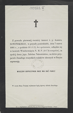 Zawiadomienie o nabożeństwie rocznicowym w kościele l'Assomption (Paryż).