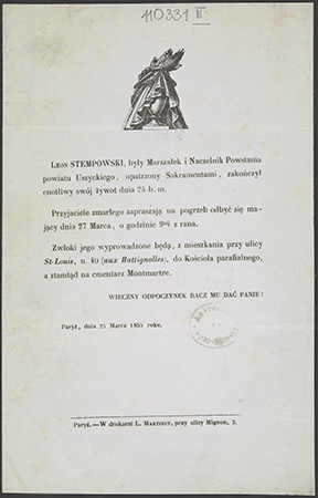 Zawiadomienie o pogrzebie na cmentarzu Montmartre (Paryż).