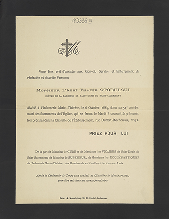 Zawiadomienie o pogrzebie na cmentarzu Montparnasse.