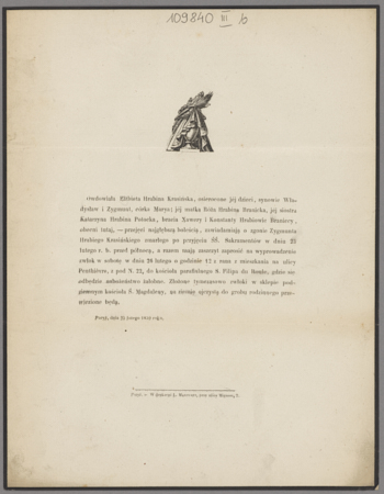 Zawiadomienie o śmierci Zygmunta Krasińskiego oraz nabożeństwie żałobnym w kościele św. Filipa du Roule i tymczasowym złożeniu zwłok w kościele św. Magdaleny.