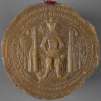 Legenda w podwójnym otoku częściowo uszkodzona i źle widoczna: LODOVICVS DEI GRACIA HVNGARIE DALMACIE CROACIE RAME SERVIE GALICIE LODOMERIE COMANIE BULG // ARIEQ REX PRINCEPS SALLERNITANVS ET HONORIS MONTIS SANCTI ANGELI DOMINVS. W polu pieczęci król na tronie z wysokimi poręczami i ozdobnym zapleckiem, w prawej ręce trzyma berło, w lewej jabłko, po jego obu stronach tarcze: po prawej dzielona pionowo z pasami i kwiatami lilii, po lewej krzyż podwójny.