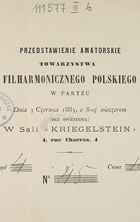 "Towarzystwo Filharmoniczne Polskie w Paryżu" [pieczątka owalna].