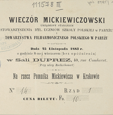 Tyt. nagł.: Wieczór Mickiewiczowski urządzony staraniem Stowarzyszenia Byłych Uczniów Szkoły Polskiej w Paryżu i Towarzystwa Filharmonicznego Polskiego w Paryżu : na rzecz pomnika Mickiewicza w Krakowie.