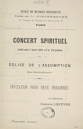 Nad tekstem: École de Musique Religieuse Fondée par L. Niedermeyer 10, Passage de l'Elysées des beaux-Arts, 10 Paris.