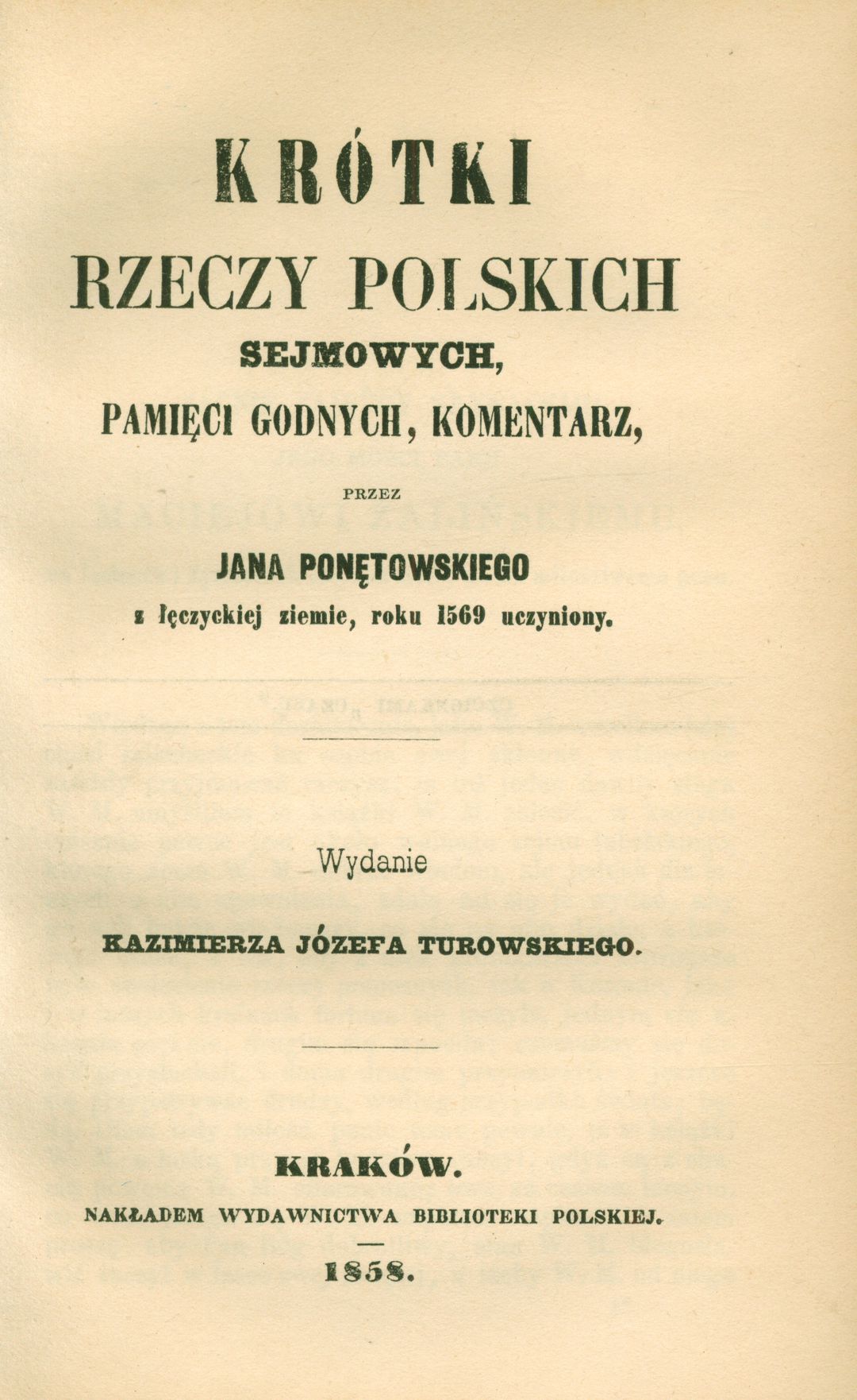 Tyt. okł.: Krótki rzeczy polskich sejmowych, pamięci godnych, komentarz Jana Ponętowskiego, oraz : Deliberacya o społku i związku Korony Polskiej z pany chrześcianskiemi przeciwko Turkowi