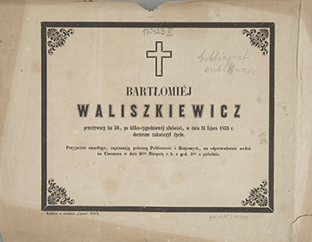 [Nekrolog. Incipit] Bartłomiej Waliszkiewicz przeżywszy lat 56, [...]. - [Kraków : wydawca nieznany, 1855] (Kraków : Drukarnia "Czasu"). - [1] karta ; 24x32 cm.
