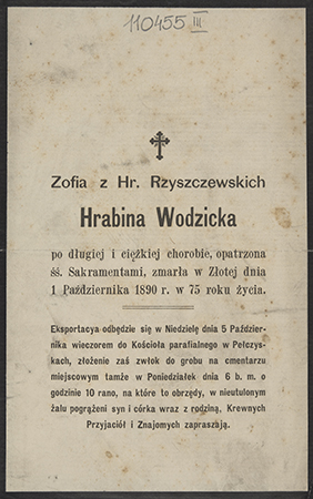 [Nekrolog. Incipit] Zofia z Hr. Rzyszczewskich Hrabina Wodzicka, [...]. - [Miejsce nieznane] : [wydawca nieznany], 1890. - [4] strony (1 karta złożona) ; 19x12 cm.