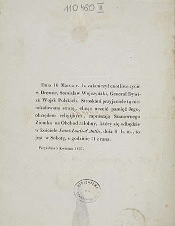 Zawiadomienie o śmierci (w Dreźnie) i nabożeństwie żałobnym w kościele Saint-Louise-d'Antin (Paryż).