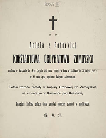 Zawiadomienie o pogrzebie w kaplicy grobowej Zamoyskich w Kamionce pod Kozłówką.