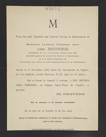 Zawiadomienie o nabożeństwie żałobnym i pogrzebie na cmentarzu Montmorency.