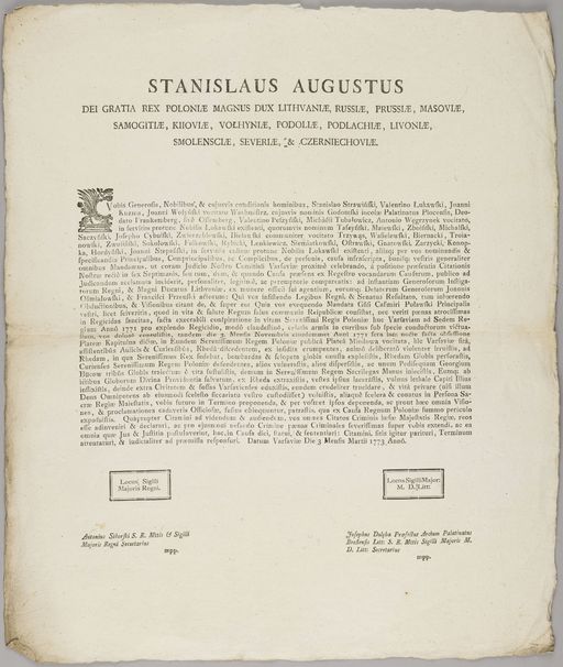 Data na końcu tekstu: Datum Varsaviæ Die 3 Mensis Martii 1773 Annô.