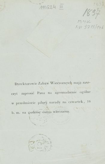 Incipit: Dyrektorowie Zabaw Wieczornych mają zaszczyt zaprosić Pana na zgromadzenie ogólne [...].