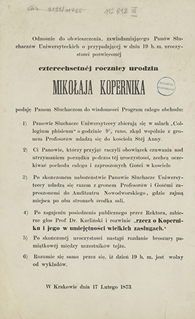 Incipit: Odnośnie do obwieszczenia, zawiadamiającego Panów Słuchaczów Uniwersyteckich o przypadającej w dniu 19 b. m. uroczystości poświęconej czterechsetnej rocznicy urodzin Mikołaja Kopernika podaję Panom Słuchaczom do wiadomości Program całego obchodu