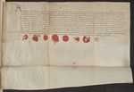 Wyszczególnieni z imienia biskupi i dygnitarze koronni poświadczają że rada miasta Krakowa wypłaciła na ręce Piotra Kmity wojewody krakowskiego marszałka koronnego Jakuba z Szydłowca podskarbiego koronnego i Mikołaja Lanckorońskiego z Brzezia 3 tysiące florenów tytułem podatku miejskiego i czopowego