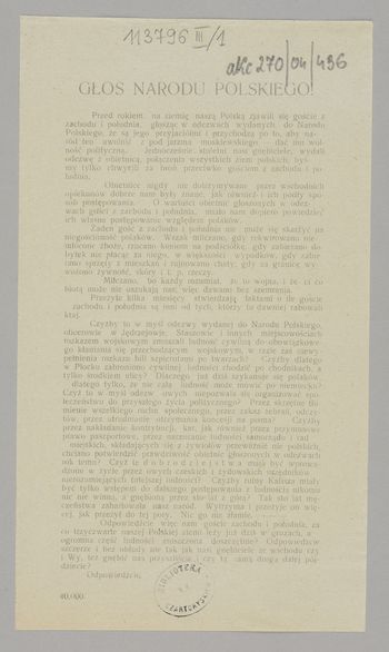 Głos narodu polskiego do Szanownego Duchowieństwa! - [Miejsce nieznane : wydawca nieznany, 15 VIII 1861]. - [2] strony ; 17x19 cm.