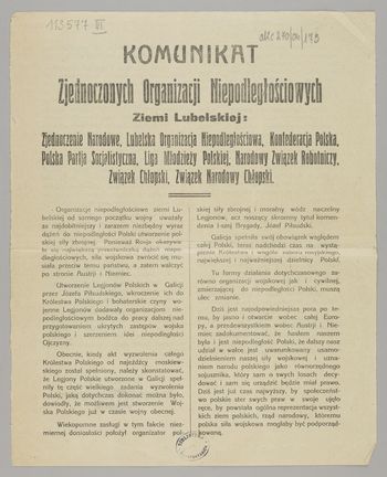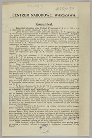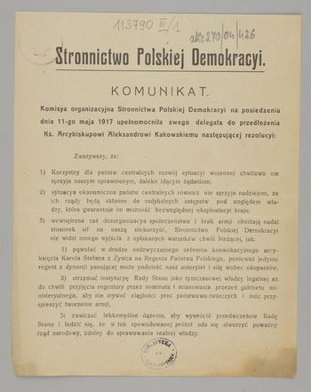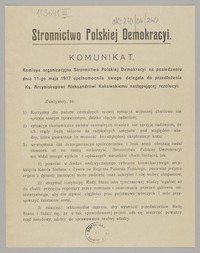 Komunikat / Stronnictwo Polskiej Demokracyi. - [Miejsce nieznane] : [wydawca nieznany], 1917. - [1] karta ; 22x17 cm.