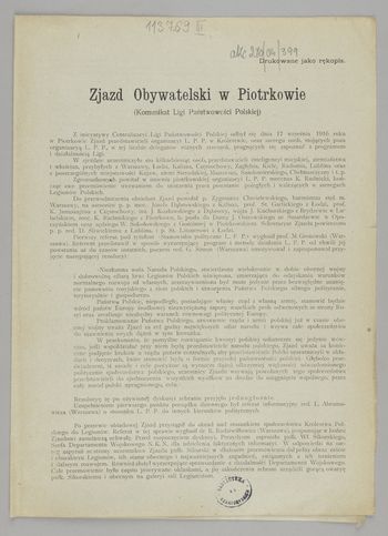 Zjazd Obywatelski w Piotrkowie : (Komunikat Ligi Państwowości Polskiej). - [Miejsce nieznane] : [wydawca nieznany], [1916 IX 17 po]. - [1] karta złożona (3 strony) ; 29x21 cm.