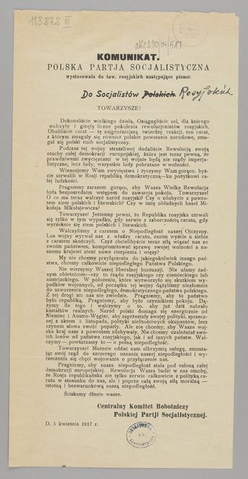 W incipicie wydrukowano: Do Socjalistów Polskich ..., w ulotce skreślono "Polskich" i zastąpiono "Rosyjskich".